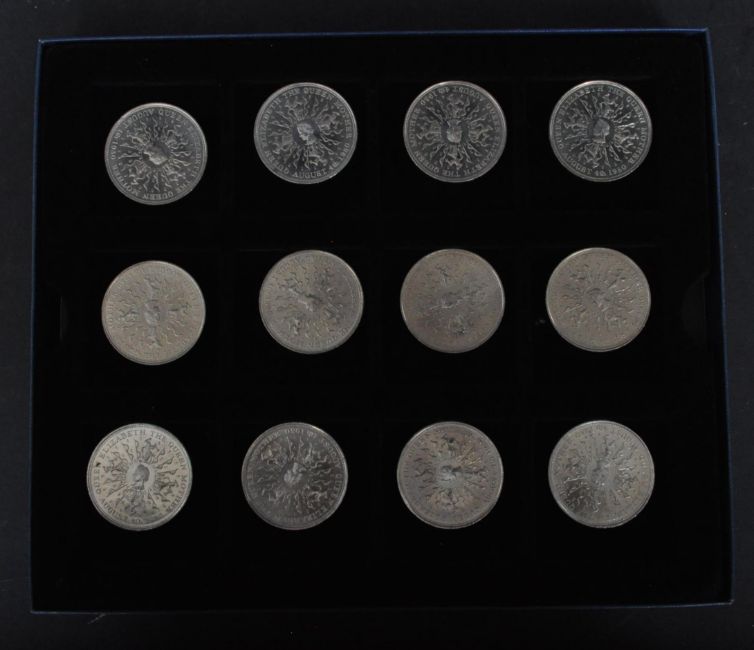 A collection of twelve Elizabeth II Queen Mother 1980 80th Birthday crown coins within Westminster Mint display box.