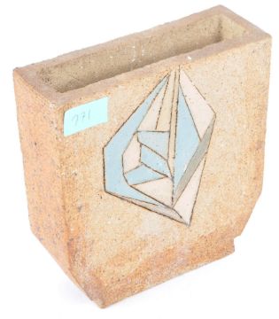 A vintage retro mid 20th century studio art pottery vase in the manner of Troika having hand painted geometric motif to centre upon an inverted stepped foot.