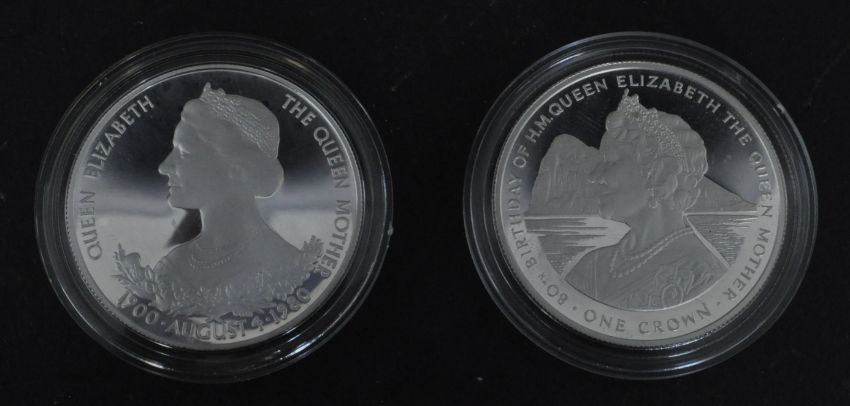 An assortment of four Royal Mint & Pobjoy Mint Elizabeth II silver proof coins to include The Queen Mother 80th birthday one crown Gibraltar coin, The Queen Mother Guernsey 25 Pence coin, The Queen Mother 1980 crown coin, The Queen Mother Isle of Man One Crown coin. Two cased and within presentation cases and two simply cased.