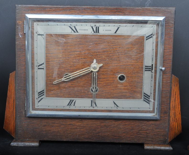 A collection of three early 20th century circa. 1930's Art Deco oak and walnut cased mantle clocks having a mixture of eight day and Westminster chime movements and being in a variety of shapes to include domed form and more angular form.