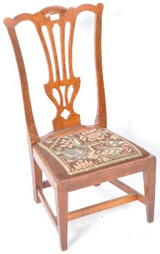 A 19th Century Victorian oak low gossip Chippendale manner chair designed by Wheeler of Arncoach having a shaped pierced vase splat back having an inset tapestry seat raised on tapering square legs. Measures approx; 79cm x 42cm x 37cm.