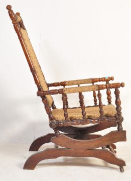 A late 19th Century Victorian mahogany aesthetic movement Boston Rocker - American Rocking chair / armchair. Raised on sleigh base with sprung rock action, upholstered seat with spindle gallery arms and backrest. 104cm h x 55cm w x 70cm d