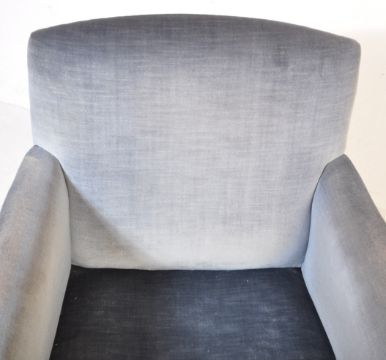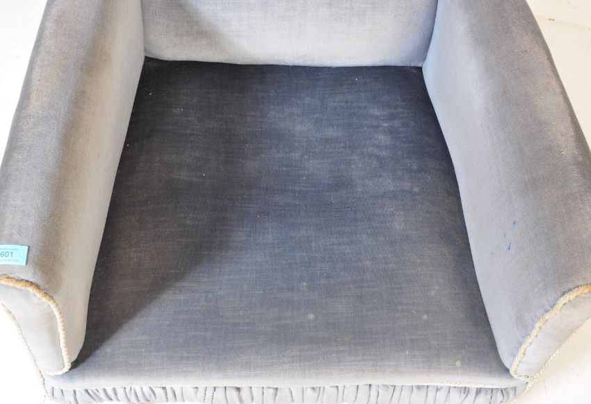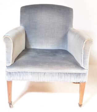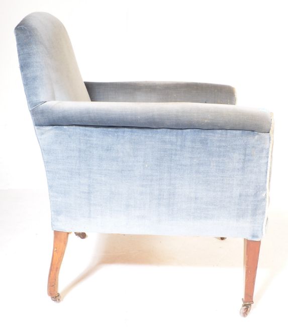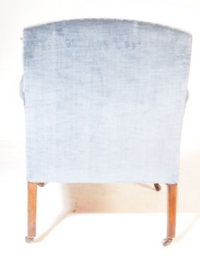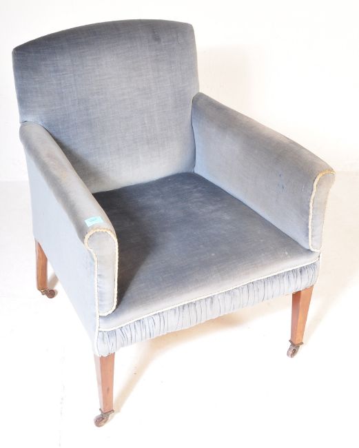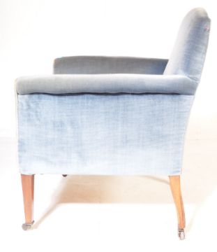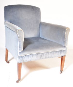 An Edwardian mahogany salon / library armchair. Raised on square tapering legs with castors having blue velour upholstery with white piped edges.