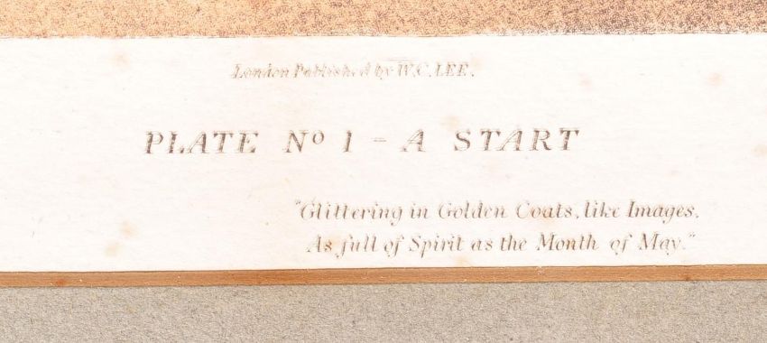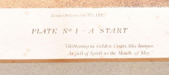 C.R. Stock  - A complete collection of six early 19thcentury circa. 1820's  C. R. Stock hand coloured aquatint proof engraving etching prints depicting cockfighting. Each print depicting a different scene within the cock fight entitled 'A Start, 'Getting to Work', 'Business', 'Fast Locked' 'One Down' and 'Victory'. London published W. C. Lee. All framed and glazed. Measures 68cm x 37cm.