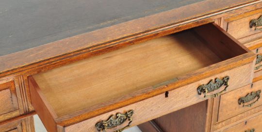 A 19th century Victorian oak writing desk having a leather writing skiver over a run of three drawers with brass handles raised on two pedestals atop plinth bases. measures approx: 74cm x 123cm x 66cm