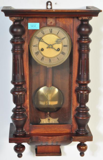 A 19th century Victorian mahogany Vienna wall clock having a gilt brass face with black roman numeral to the chapter ring within a full length glazed door flanked by turned half columns with corresponding pendant finials. Eight day spring driven movement. Measures 52cm in length.