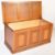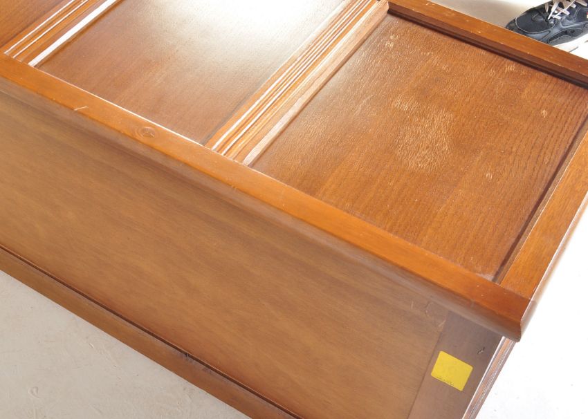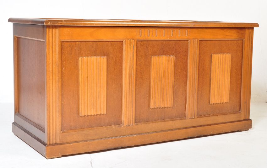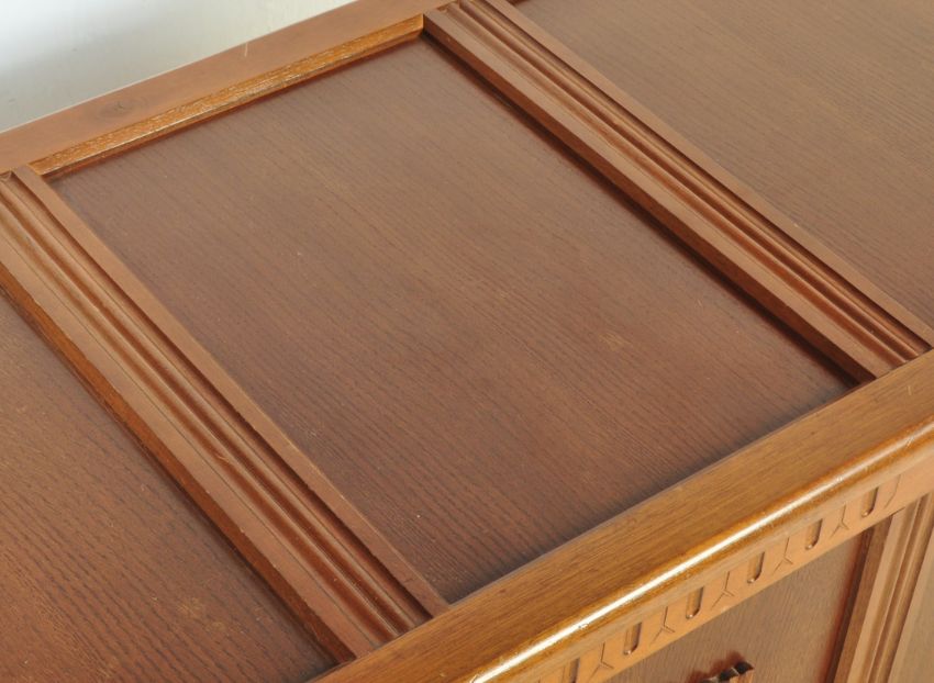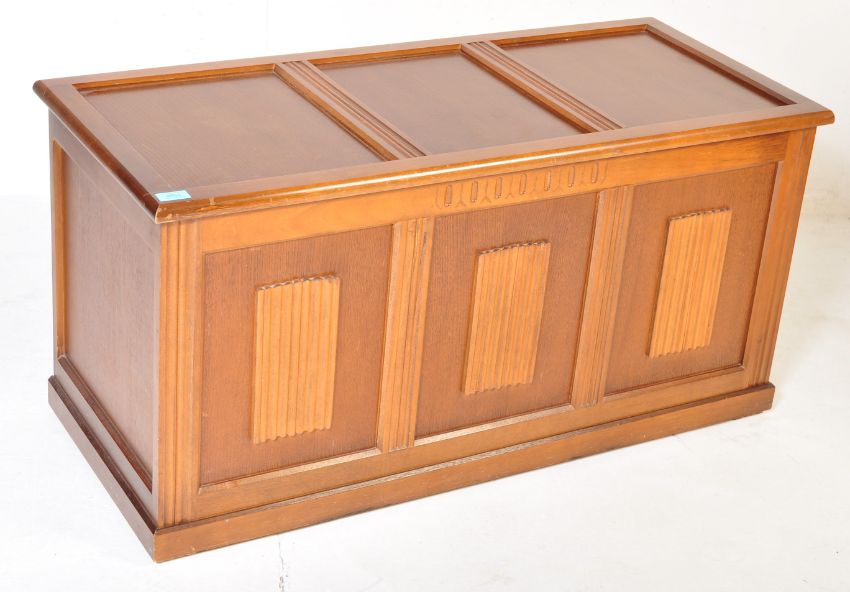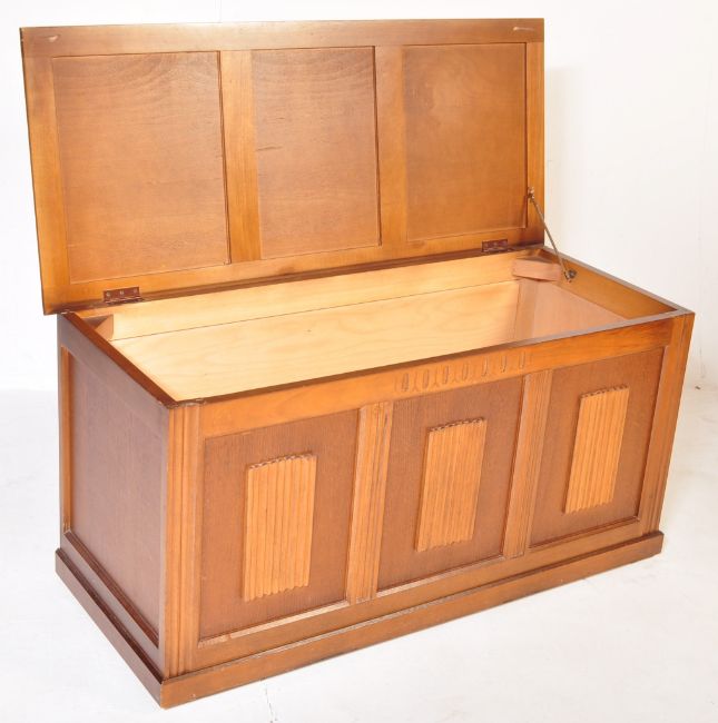 A 1950s Jacobean Revival oak coffer chest having linen fold motifs to the panelled front, hinged lid opening to reveal a shelved interior raised on a plinth base.