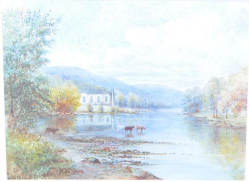 W. H. Sawnon (unknown years). A vintage mid 20th century watercolour on paper depicting a country side scenery with river and cattle and trees in the foreground; mansion and hills in the background and sky above. Painted in bright and autumnal colours, the watercolour is signed to the bottom left. It is mounted with golden decorations around the mount and framed and glazed in a guilt wooden frame. The watercolour measuring approx. 56 x 48cm.