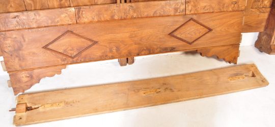 A 19th century French solid walnut bed frame. The head and footboard having a scroll top to the headboard and footboard and each having a walnut panel. Measures approx: 101cm x 185cm x 128cm