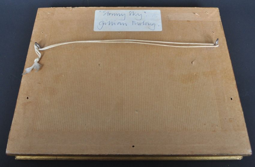 Gillian Furlong - Stormy Sky (20th Century). A vintage 20th century oil on board painting of a coastal scene with a couple walking on a beach. Signed to the corner. Gilt frame. Measures 20cm x 25cm.