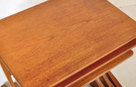 Nathan Furniture - A retro vintage mid 20th century circa. 1970's nest of three Nathan teak tables. The rectangular tops on curving cross over x-frames end support. Measures approx: 51cm x 61cm x 43cm