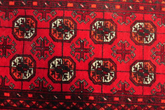 A 20th century Afghan Islamic Bakhtar floor runner rug carpet. The rug having a central panel with a repeating circular motif set within a geometrically patterned border.