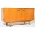 A retro vintage mid 20th century teak wood side board credenza having angular recessed handles two the double door cabinet opening to reveal a shelved interior raised op tapering supports. Measures 72cm x 137cm x 47cm.