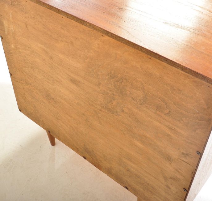 A retro vintage mid 20th century circa. 1960's teak chest of drawers. The chest of drawers having a bank of four rectangular drawers, all with chrome bar handles and being raised upon tapering supports. Measures approx: 84cm x 92cm x 46cm