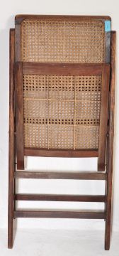 A pair of 20th century oak and wicker folding dining chairs. Each having a treated oak wood frame and wicker cane back rest and seats. Measures approx: 83cm x 42cm x 50cm.