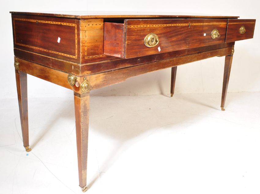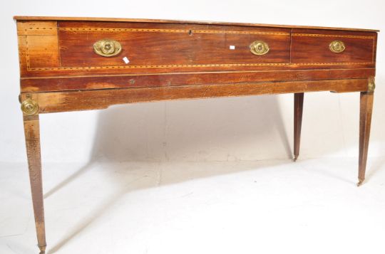 An 18th century George III mahogany square Piano Forte / hall table. The top having a flared top with inlaid decoration set with oval brass handles and raised on tapering legs. measures approx: 82cm x 162cm x 58cm