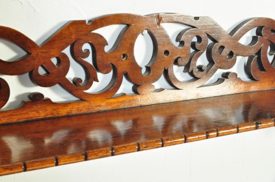 A set of 19th century Victorian oak shelves having a pierced floral gallery back atop three tiered shelves flanked by pierced floral supports. measures approx: 82cm x 78cm x 21cm