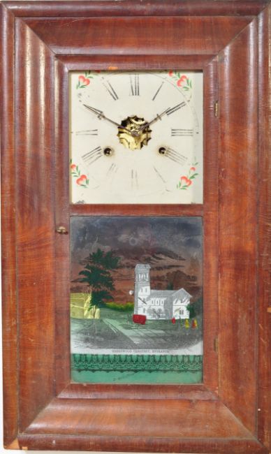 A collection of three early 20th century American wall hanging station clocks of rectangular form having Roman numerals to the chapter ring with a glass painting scene below. Measures approx: 79cm x 43cm x 11cm.