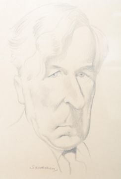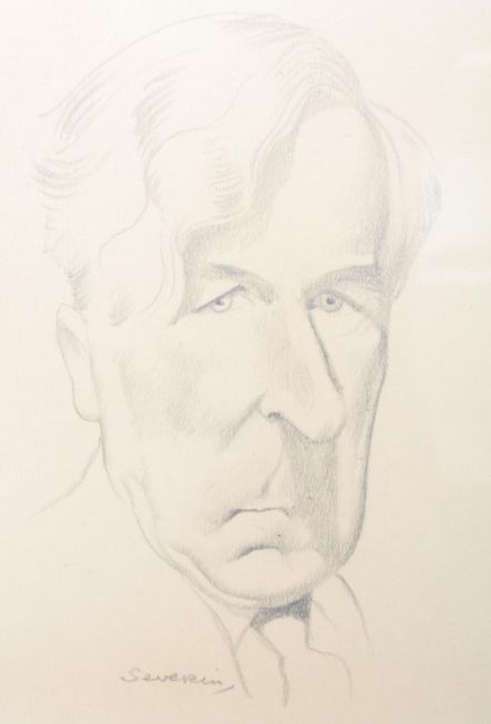 Mark Severin (1906-1987) A signed pencil portrait sketch by Belgium erotic illustrator and print maker, Mark Fernand Severin. Depicting a frowning male sitter with caricatured elongated features. Framed and glazed. Measures 24cm x 19cm.
