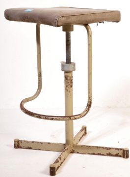 A retro vintage mid 20th century industrial factory engineers chair having a square cushioned seat upholstered in grey leatherette fabric raised on a single chrome support atop a circular base. Measures approx: 68cm x 56cm x 56cm