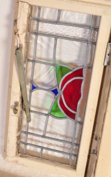 A collection of twelve vintage 20th century stained glass windows of square form having polychrome floral decoration, lead lined windows with painted frames. measures approx: