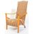 A 1930's Heals style beech wood fireside armchair. Raised on squared legs with shaped arches to the underside of the elbow rests, original upholstered overstuffed seat and back rest. Measures 997cm x 56cm x 71cm.