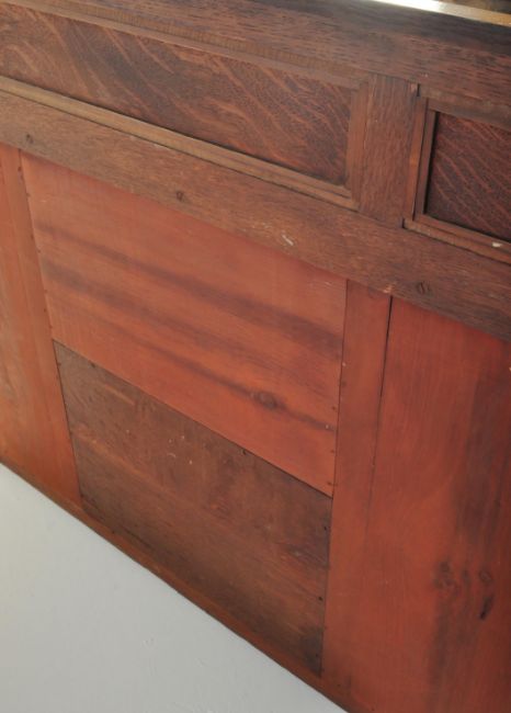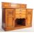 A 19th century Victorian Arts & Crafts oak sideboard credenza having a tri panelled gallery back over a bank of three drawers atop a dog kennel flanked by single door cabinets raised on a plinth base.