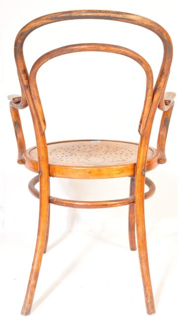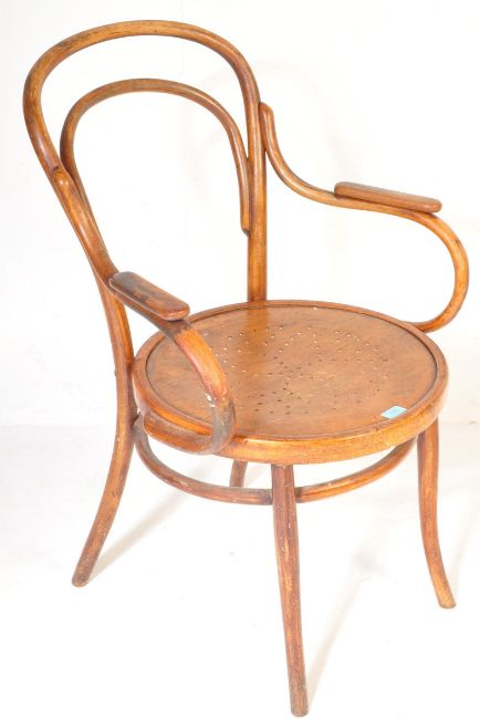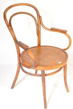 An early 20th century bentwood cafe chair / armchair in the manner of Thonet. Raised on turned legs with upper peripheral stretchers having panel seats with bentwood back rest and elbow supports.