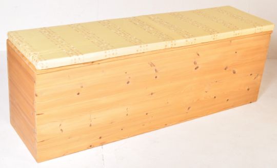A large vintage 20th century pine blanket of cuboid form having a hinged lid opening to reveal a spacious interior. Measures approx: 49cm x 149cm x 41cm