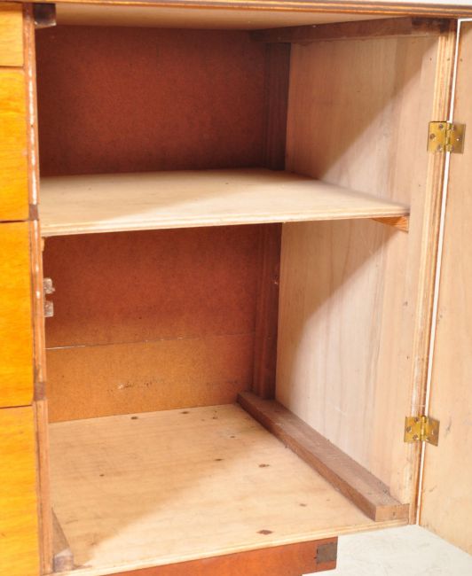 A retro mid 20th century sideboard having a bank of three drawers to the centre flanked by two cupboards, all with circular chrome handles and being raised upon tapering supports united by stretchers. Measures approx: 81cm x 142cm x 41cm