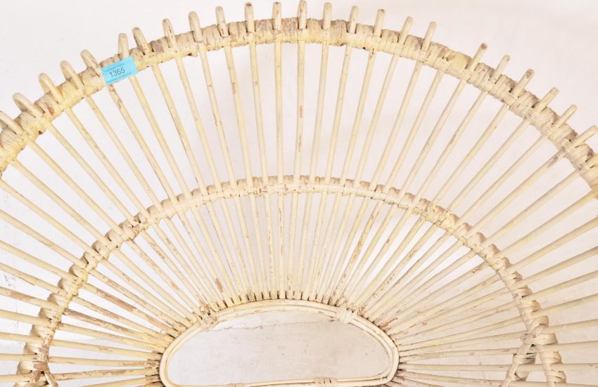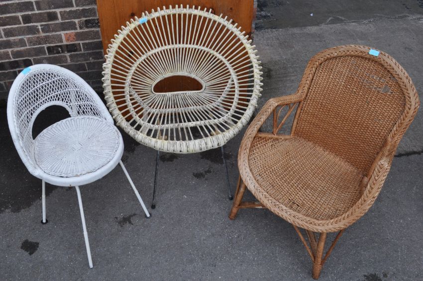 An assortment of three retro vintage 20th century bamboo chairs to include a bamboo rattan egg type chair, a wicker woven charger chair and a painted white wicker stool.