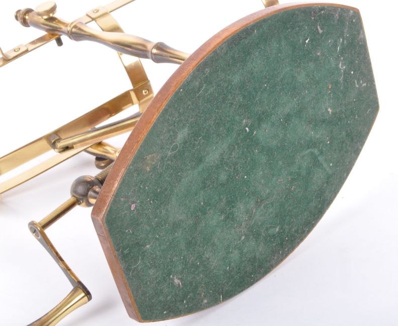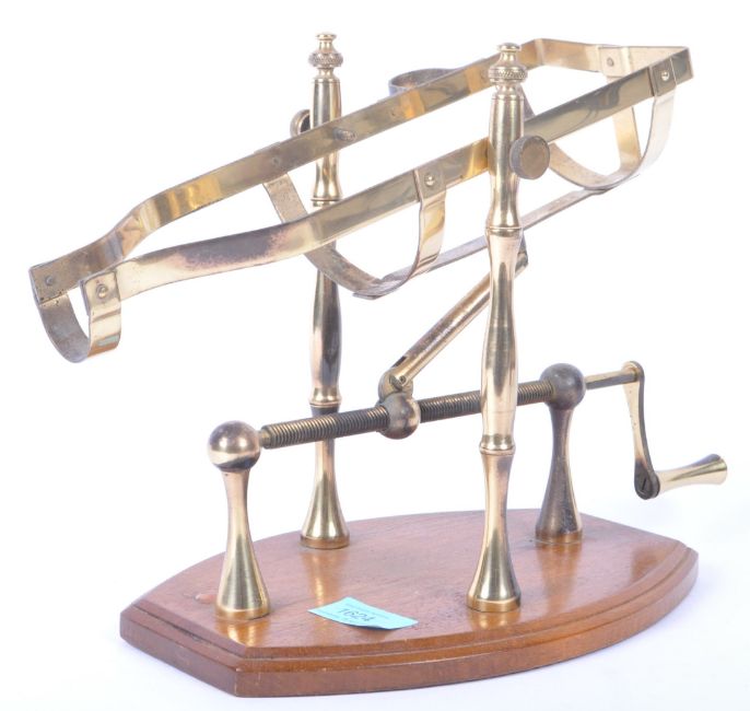 An early 20th century brass mechanical wine bottle decanting cradle / wine bottle holder mounted on an oak base.