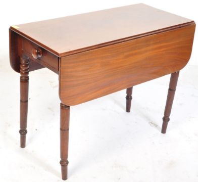 A 19th century early Victorian mahogany drop leaf Pembroke / occasional table. The solid mahogany table having a single drawer to one end with drop leaves either side being raised on fly supports. All raised on turned, tapering legs with brass castors. Measures 73cm x 92cm x 45cm.