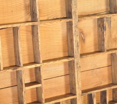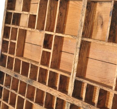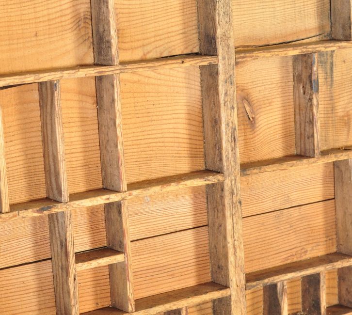 An original early 20th Century vintage wooden printers block printers tray of large size having a framed edge with various sized sectional compartments within. Measures approx; 94cm x 64cm.
