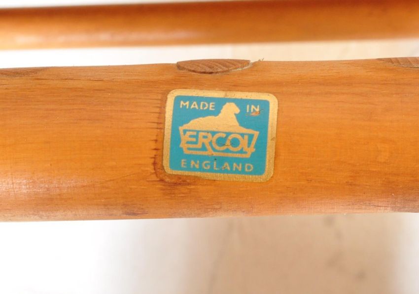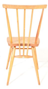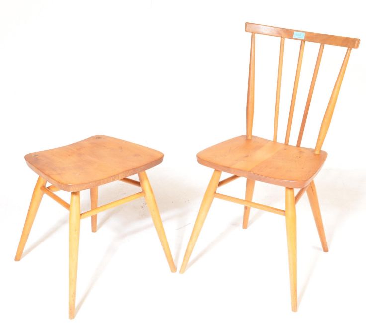 Ercol - A retro mid 20th century beech and elm stick back side / dining chair having a saddle seat and stick back backrest attached to the top rail and leg spindle stretcher being raised on spindle legs and finished in the blonde colourway. Accompanied by matching stool. Measures 79cm x 38cm x 42cm.