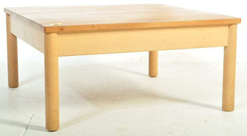 A 20th century Ercol Furniture blond beech and elm wood square coffee occasional table. The raised on turned legs with fitted frieze frame and square elm top above. Makers label to underside. Measures 34cm x 69cm x 69cm.