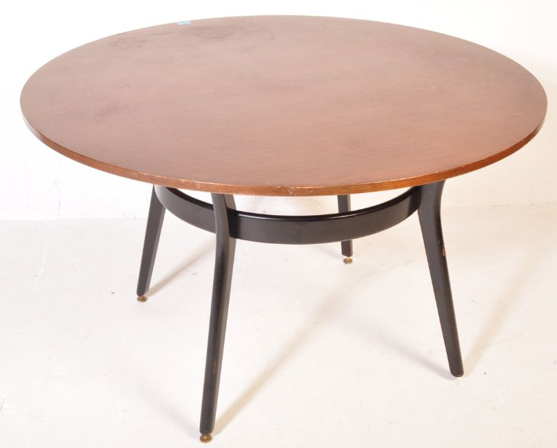 G-Plan - E. Gomme - A retro vintage mid 20th century teak wood G Plan dining table of circular form over four black ebonised sabre type splayed supports over brass feet. Measures 73cm x 122cm x `122cm