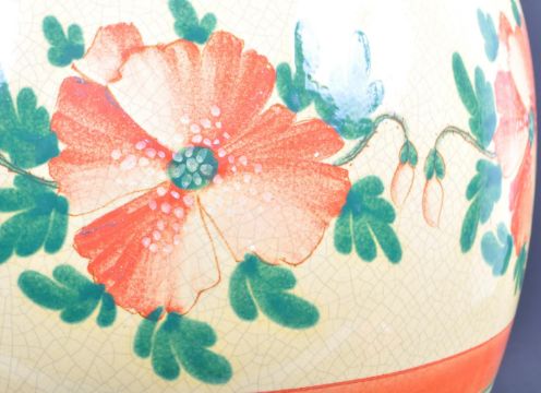 Two vintage mid 20th century hand painted crackle glaze ceramic lamp stands of bulbous colourful ovoid form having floral detailing decorated in a orange and green colourway. Artists signature to the base. Measures 54cm high.