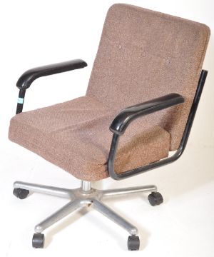 A retro vintage circa 1960's Ring Mekanikk swivel office chair. The chair having a grey upholstered padded seat and back rest, with tubular metal arm finished with a padded ebonised arm rest. Raised on a 5 point base on wheels. Measures approx: 72cm x 60cm x 71cm