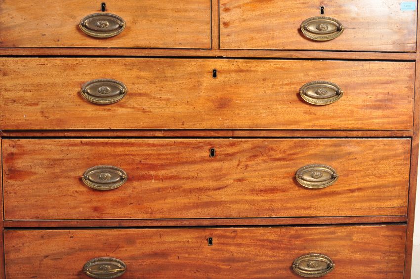 An 18th century George III mahogany chest of drawers having a flared chamfered top atop a bank of two over three drawers with oval brass handles raised on bracket feet. Measures approx: 101cm x 110cm x 54cm