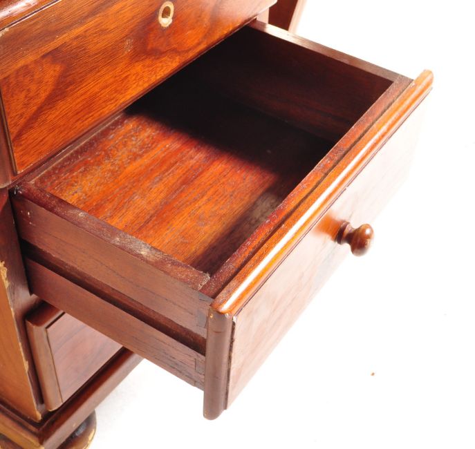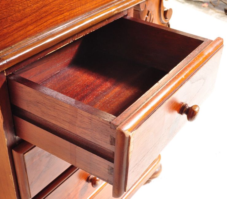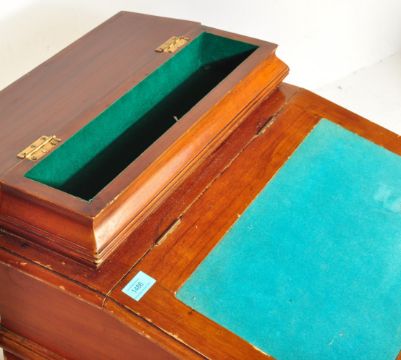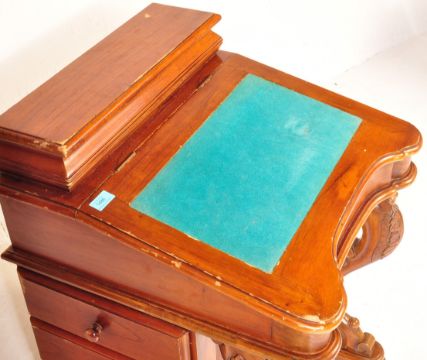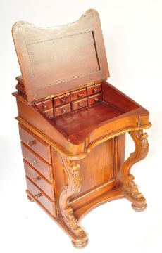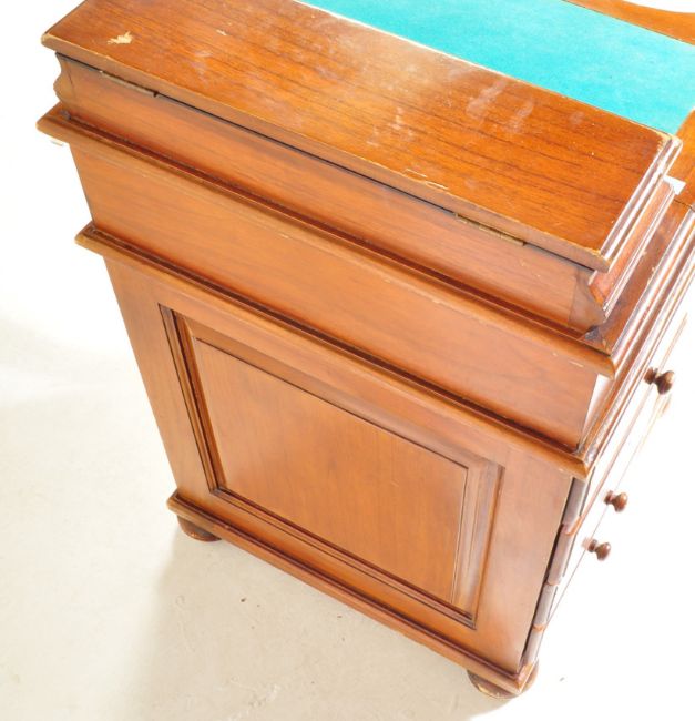 A 20th century Victorian revival mahogany Davenport table writing desk having a gallery top with chamfered edge over a writing slope fitted with green skiver and hinged lid with a serpentine facade raised over cantilever supports carved with acanthus leaves and a bank of four rectangular drawers to each side. Measures approx: 94cm x 39cm x 52cm