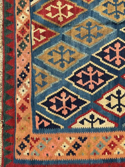 An early 20th century hand knotted South American Qashgai / Kashgai floor rug carpet. The rug having central blue ground with polychrome Aztec medallions in the middle and NAvajo motifs patterns around the edges. Measures 235cm x 170cm.