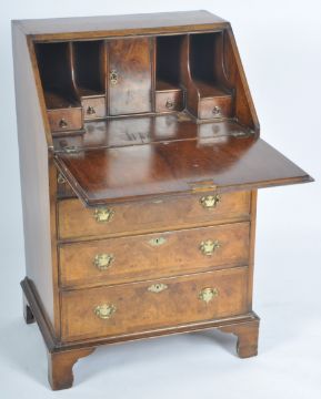 A late 19th Century Victorian Queen Anne revival burr walnut ladies bonheur de jour / writing bureau desk of good small proportions. The bureau having a crossband full front bureau sections enclosing a fully appointed interior set within. Below one small drawer over three graduating drawers below all with brass swing handles and backplates. All raised on bracket feet support. Measures approx; 93cm x 60cm x 46cm.