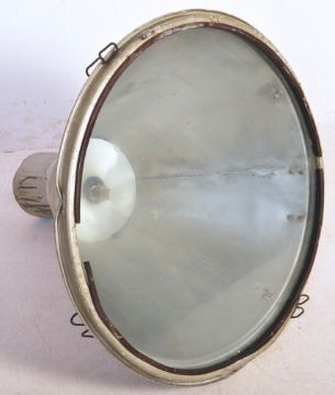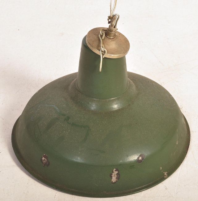 A large retro vintage mid 20th Century enamel pendant industrial factory/school light shade AF. The light having a large worn grey body, clipped front light cover with fixing. Together with a green enamel industrial lamp shade. Measures approx. 63cm x 64cm x 64cm