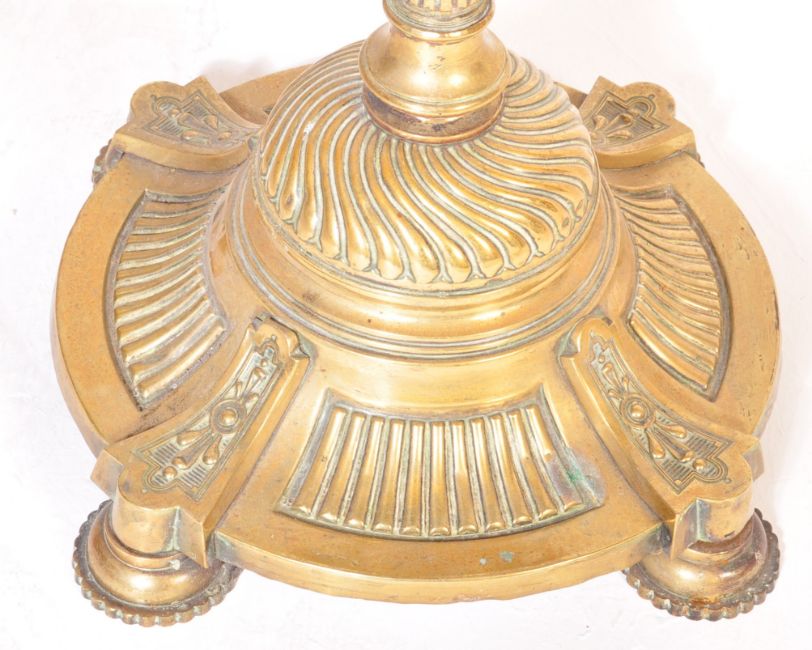 A Victorian 19th century brass standard lamp having of reeded columnar upon a circular base with gadrooning and adjustable top.