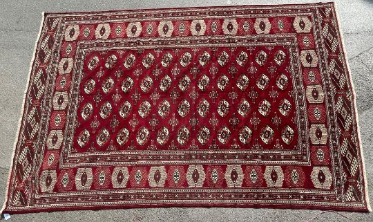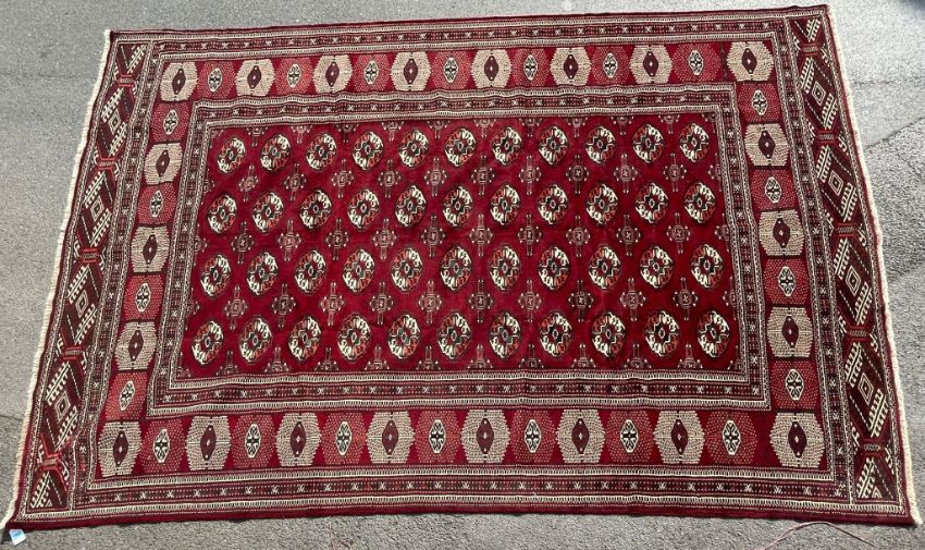 An early 20th century hand knotted Persian Islamic Turkoman floor rug carpet. The rug having a red ground with a series of central lozenges in orange and cream, with further geometric patterns around the border. Measures 390cm x 250cm.
