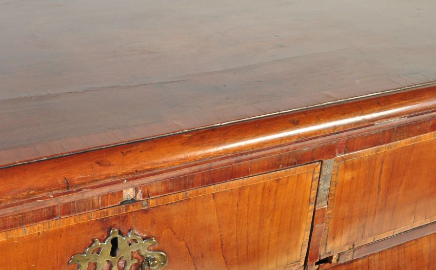 An early 18th century Queen Anne walnut chest of stand. The chest having a flared cross banded veneered edge atop a bank of two over four drawers raised on bracket feet.
