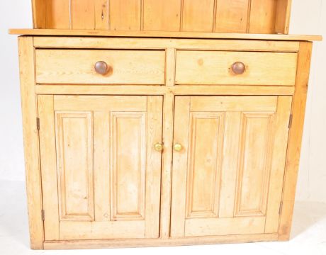 A 19th century Victorian country pine dresser having a flared top over four plate racks / shelves. The dresser base has two drawers atop a double door cabinets raised on a plinth base. measures approx: 232cm x 134cm x 43cm