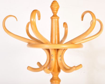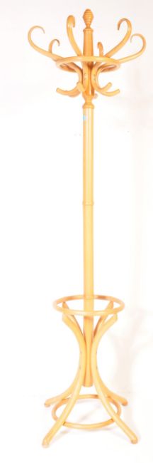 A vintage 20th century Thonet style bentwood coat stand having curved hooks to the top over a single column support with hooped umbrella stand raised on splayed legs. Measures approx: 185cm x 52cm diameter.
