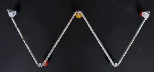 A vintage retro 20th Century sputnik atomic W - wirework coat rack having wired body and multicolour wooden coat hooks.